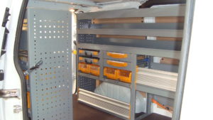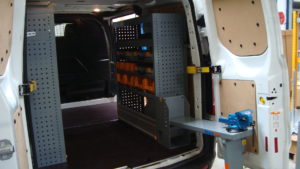 Pour une entreprise spécialisée en plomberie et sanitaire, StoreVan a aménagé un Ford Transit Custom pour le transformer en véritable atelier mobile. Un établi basculant spécial fourgon permet de travailler à l’extérieur du véhicule pour effectuer des opérations de soudage ou maintenance sur la tuyauterie et diverses opérations de plomberie directement sur les chantiers.