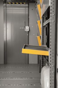 - Modularité : il est possible d’installer des séparations sur les tablettes. Ces tablettes sont perforées afin de positionner des séparations aluminium h 50 mm ou des séparateurs métalliques en hauteur 300 mm.